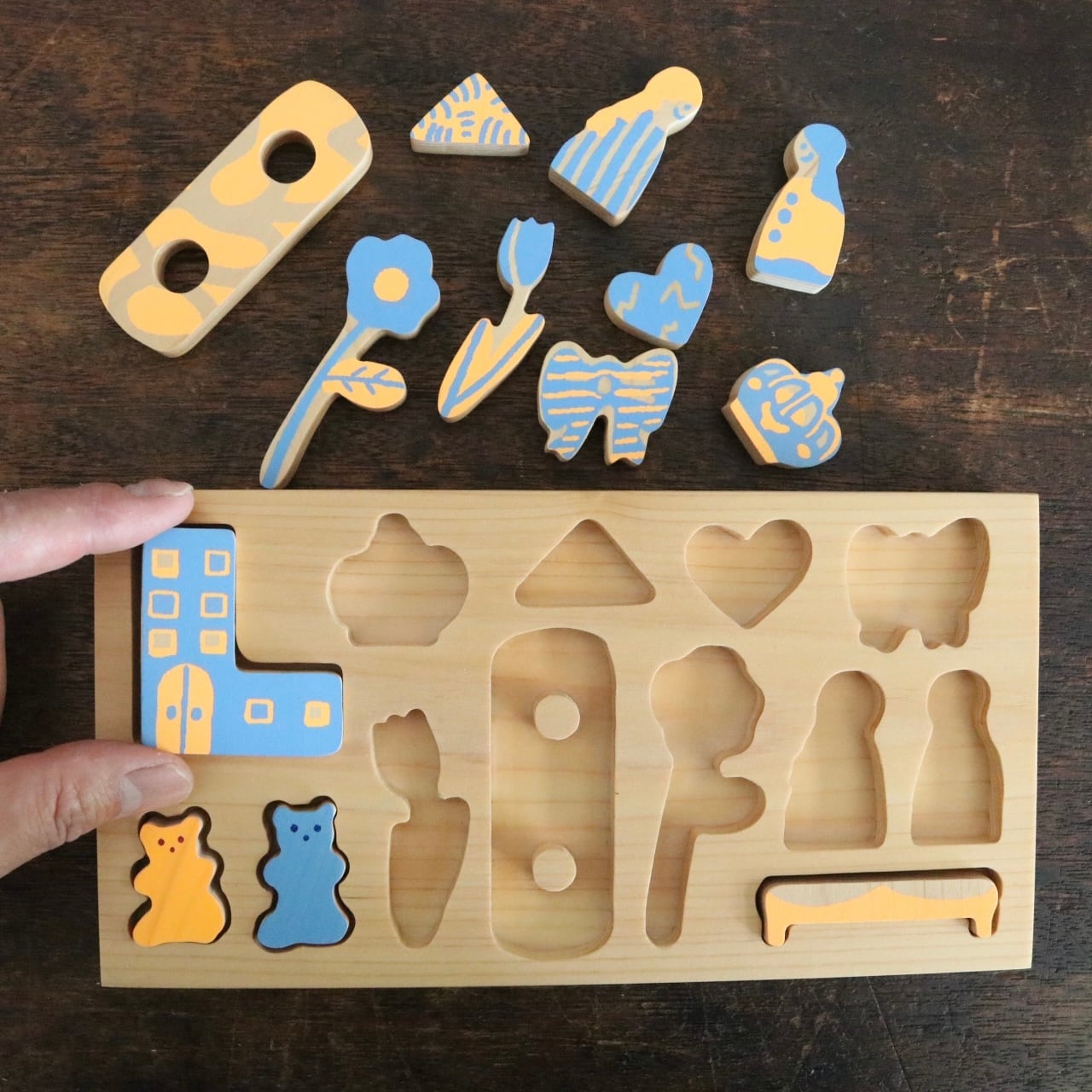 静岡県産のヒノキの無垢材を使用、水性シルクスクリーンプリントで印刷し、国産植物由来のオイル塗装でしあげています。すべて手作業でおこなっているため、版ズレなど1点ずつ違いがあります。