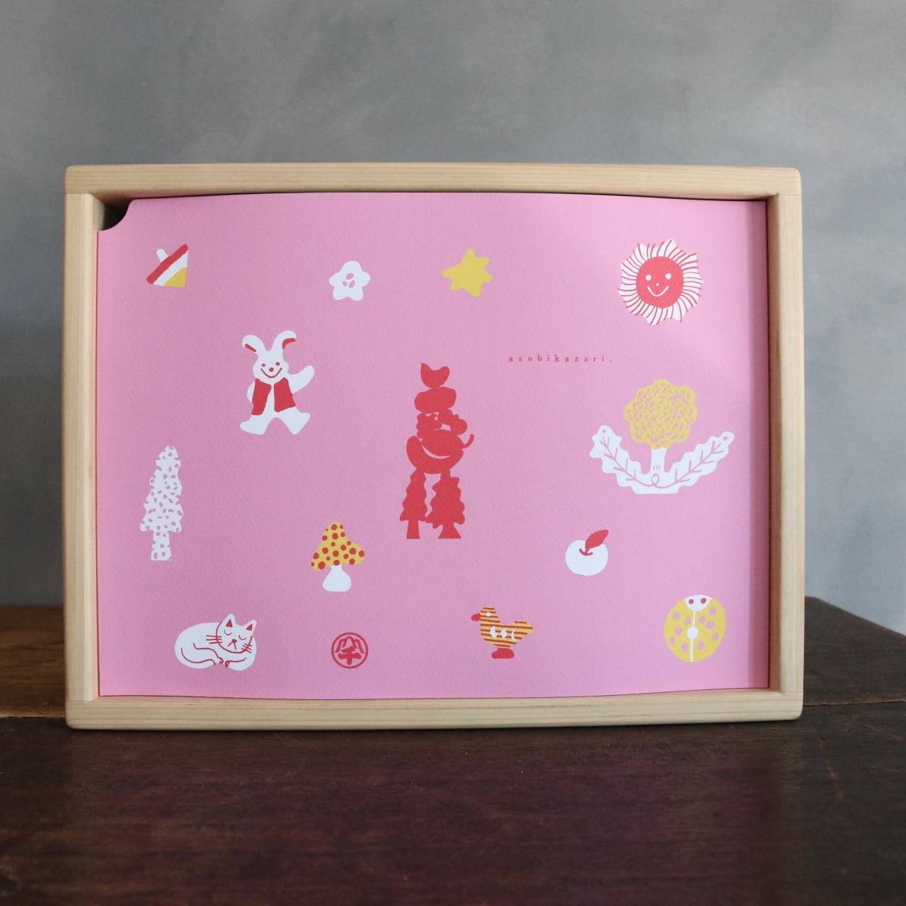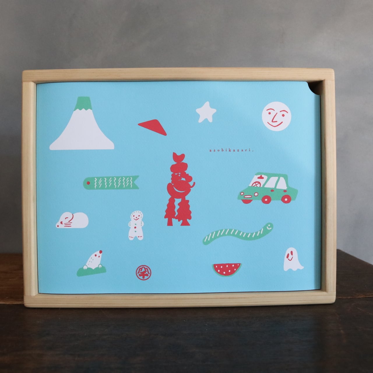 静岡県産のヒノキの無垢材を使用、水性シルクスクリーンプリントで印刷し、国産植物由来のオイル塗装でしあげています。すべて手作業でおこなっているため、版ズレなど1点ずつ違いがあります。