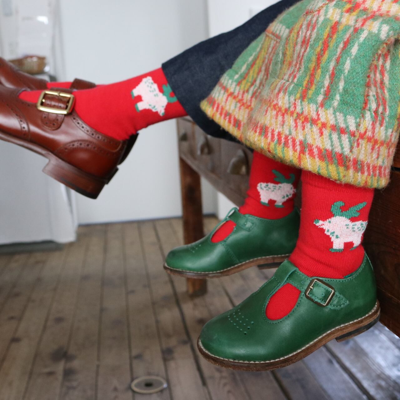 12月の遊び飾り。に登場するトナカイの柄がワンポイント入った靴下です。