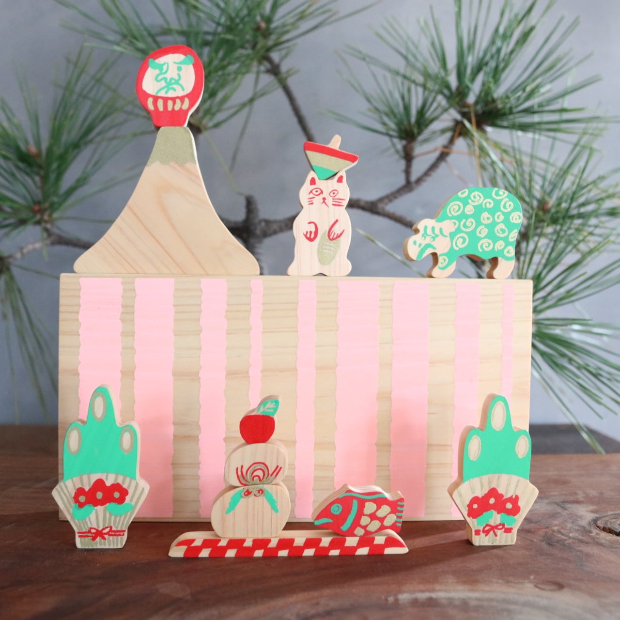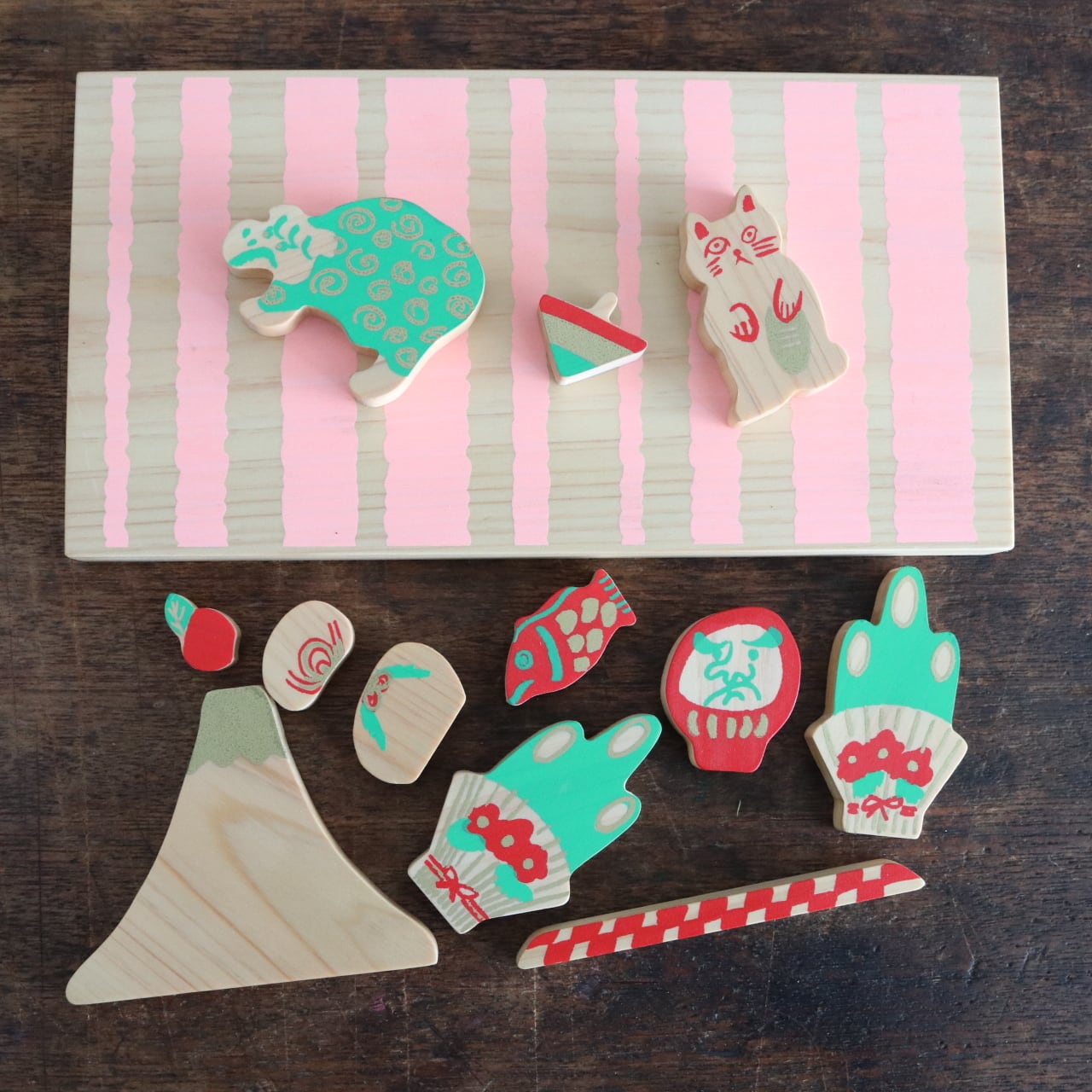 静岡県産のヒノキの無垢材を使用、水性シルクスクリーンプリントで印刷し、国産植物由来のオイル塗装でしあげています。すべて手作業でおこなっているため、版ズレなど1点ずつ違いがあります。